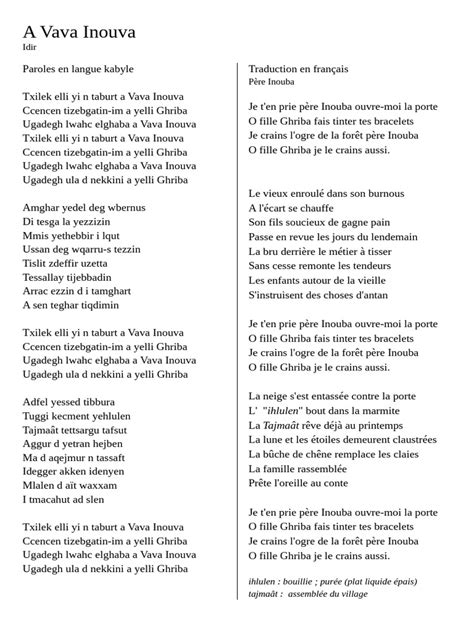 Vous pouvez trouver la traduction complète de A Vava Inouva en français sur divers sites web dédiés aux paroles de chansons. Vous pouvez également trouver des vidéos sur YouTube qui incluent à la fois les paroles en français et en kabyle, la langue d'origine de la chanson.